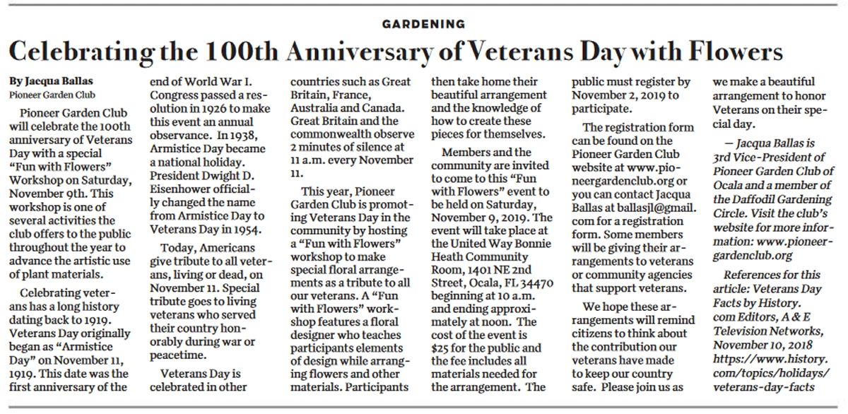 The Pioneer Garden Club of Ocala invites the public to a Patriot Day program to honor those who serve to keep homes, bus...